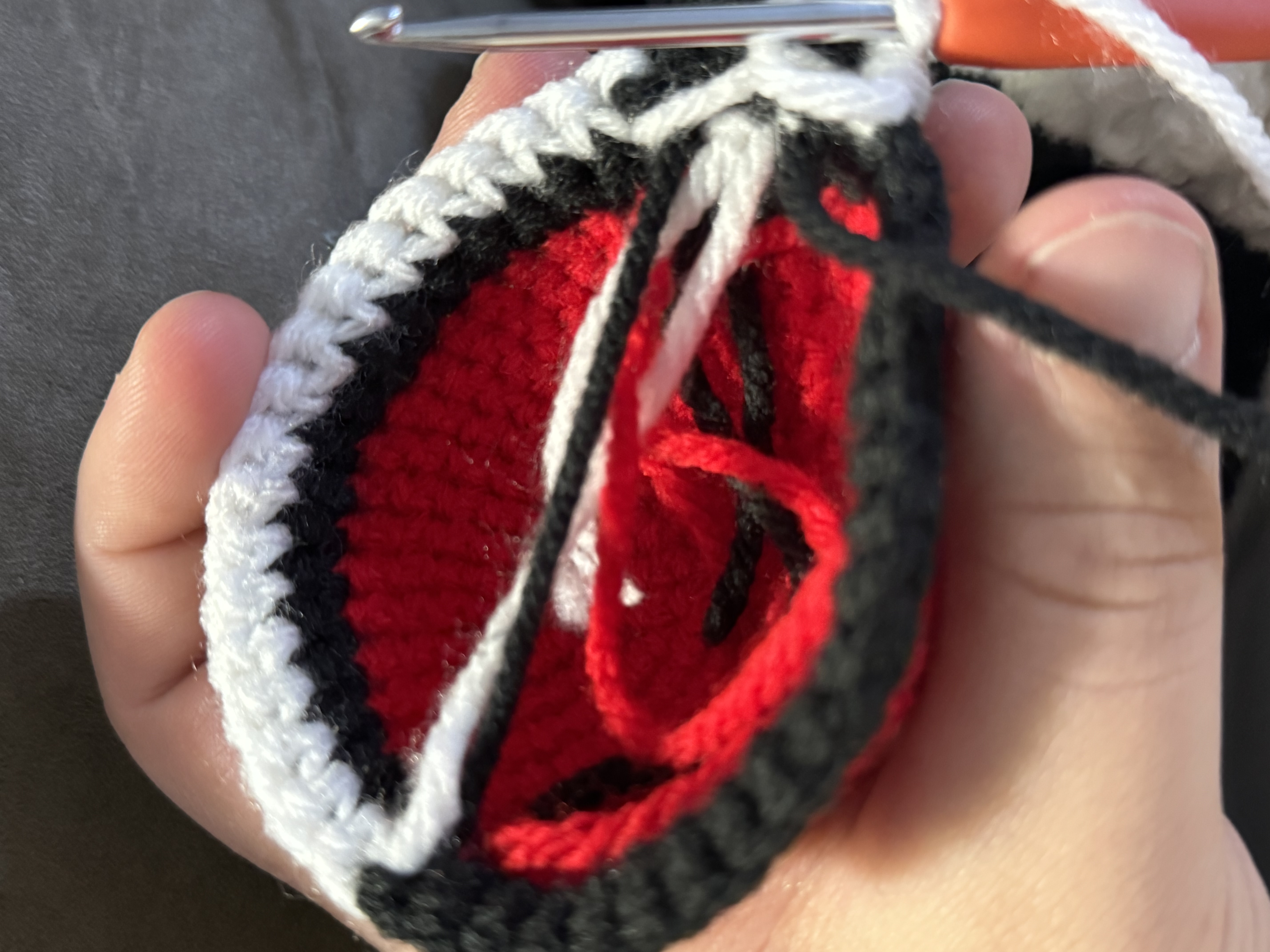 Fasten off and weave the yarn through the last row to close the hole. Tie off and weave the excess into the pokeball.